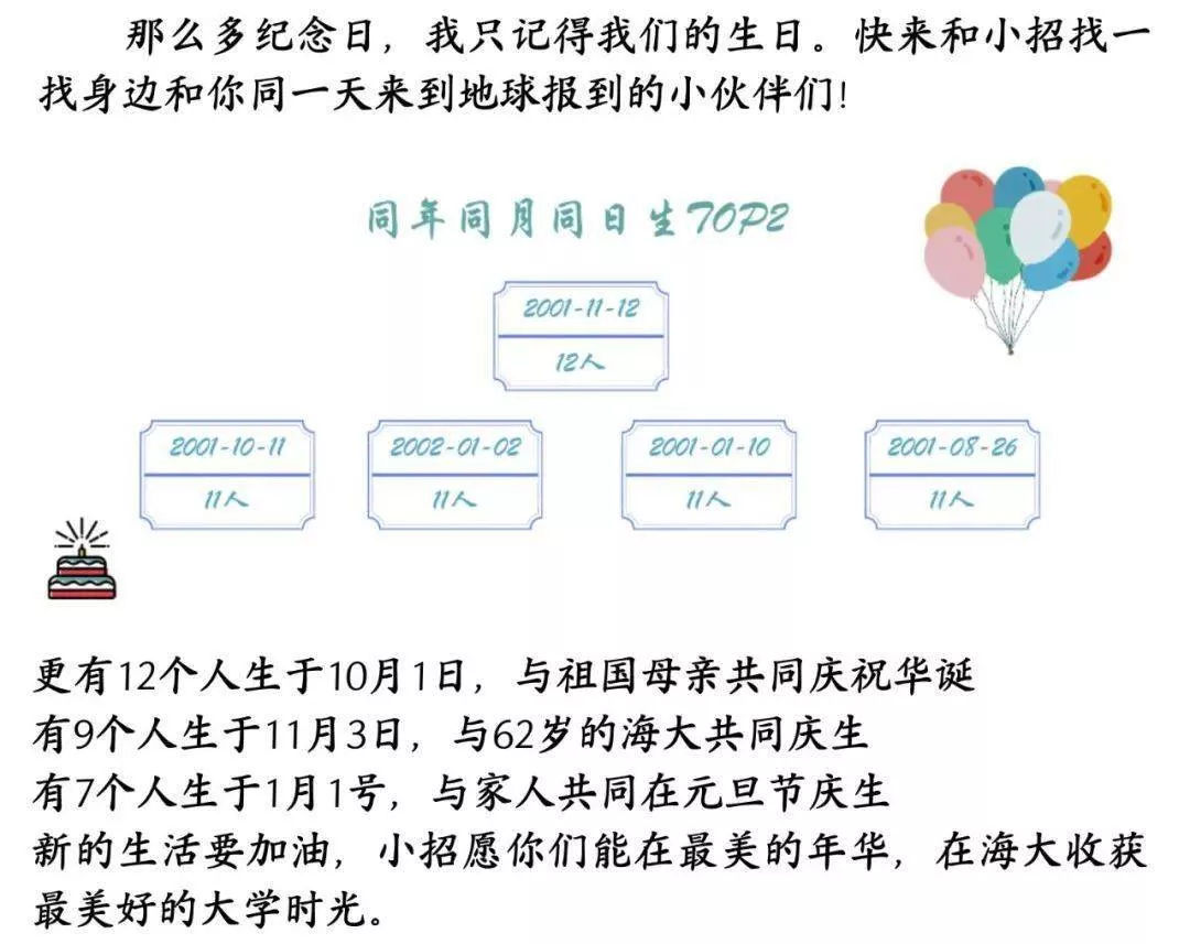 “不求同年同日生,但求......”,“沒事,我們確實同年同日生!”出生于 2001年10月11日或者 2002年3月25日的 11位小萌新們異口同聲。同時2001年10月8日與2002年8月22日的各10位小萌新也正考慮著“湖畔十結(jié)義”呢!