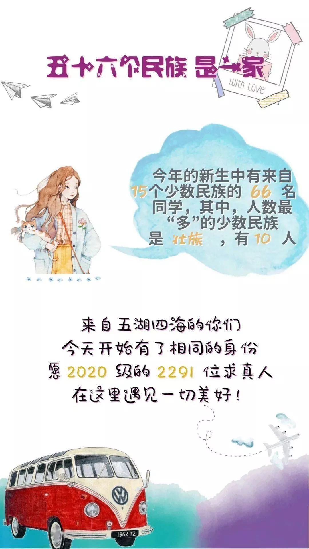 五十六個民族,五十六朵花。今年的新生中, 漢族2079人,少數(shù)民族69人,來自18個不同的民族。其中壯族人數(shù)最多,有13人。