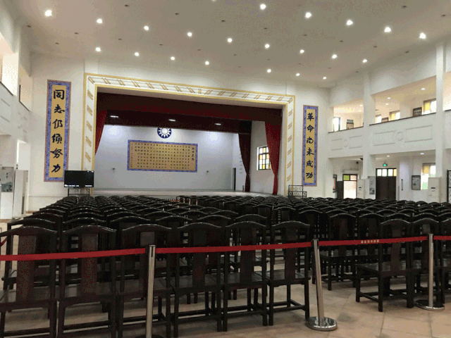 ▲紀(jì)念堂內(nèi)部大廳為劇院設(shè)計(jì),有放映室、舞臺、化妝間和觀眾席。舞臺兩端手書“革命尚未成功,同志仍須努力”十二個(gè)大字,為2009年大維修時(shí),由書法家臨摹孫中山真跡后,再采用雕塑技術(shù)雕刻。