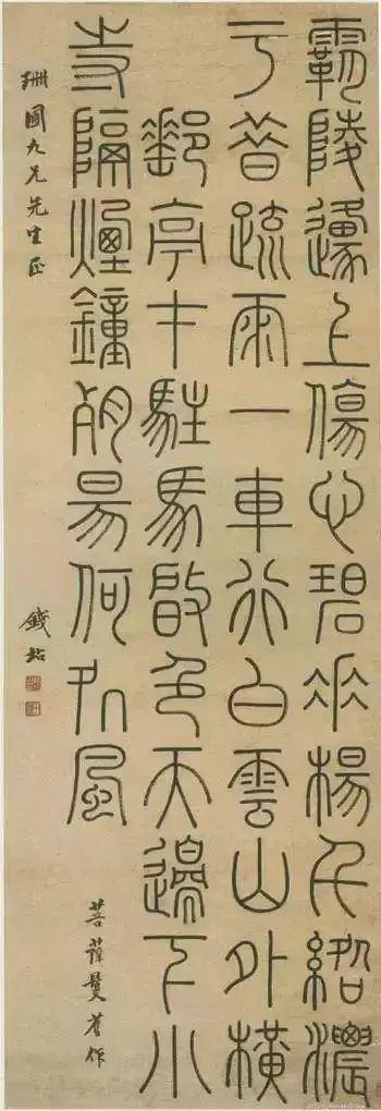 天有不測風(fēng)云,嘉慶二年(1797年),錢坫右手因病壞死,已不能再握筆作書了,于是改用左手。然而,“塞翁失馬,焉知非?!?,意外的造化弄人,卻給了他藝術(shù)生命的嬗變。此后他的篆書突破了以往的中規(guī)中矩,形成了寒瘦清古、蒼厚生動(dòng)、開闊舒展、富有變化的風(fēng)格,令人面目一新。