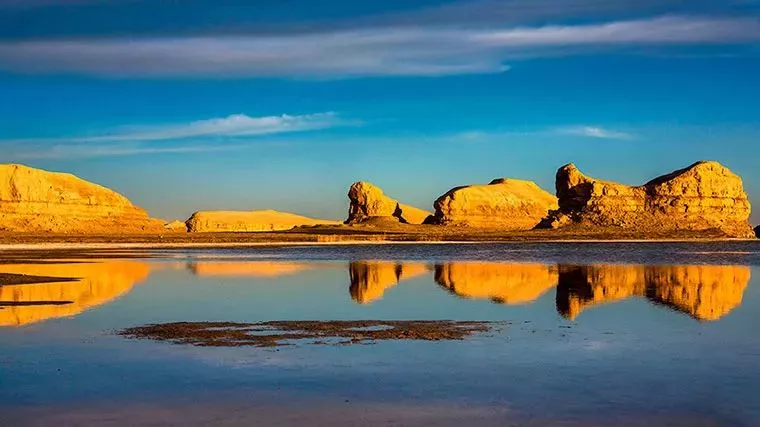 【水上雅丹】陽光照在水雅丹上,顏色金黃,石柱和倒影感覺升到了半空中,像懸浮在空中的魔幻城堡。簡直美得沒有邊了!只有各種驚嘆各種拍,完全停不下來!