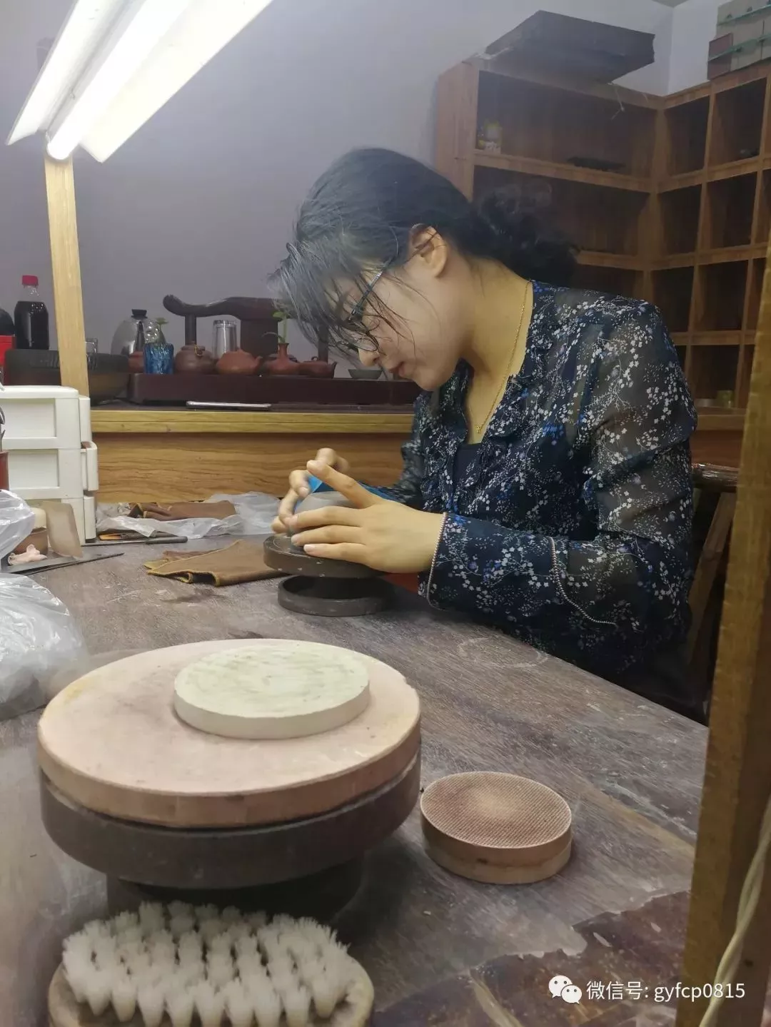 繼續(xù)游覽,在一個紫砂館里看到一位典型的江南美女正在低頭制作茶壺。這位美女自己經(jīng)營、自己制作著獨具自己特色的紫砂壺。經(jīng)過短暫交流,知道她叫顧嬌。真是名如其人,嬌媚嬌美嬌滴滴。在我的要求下,她停下手里的活計,答應我可以拍照。這才有了和美女的美好邂逅。