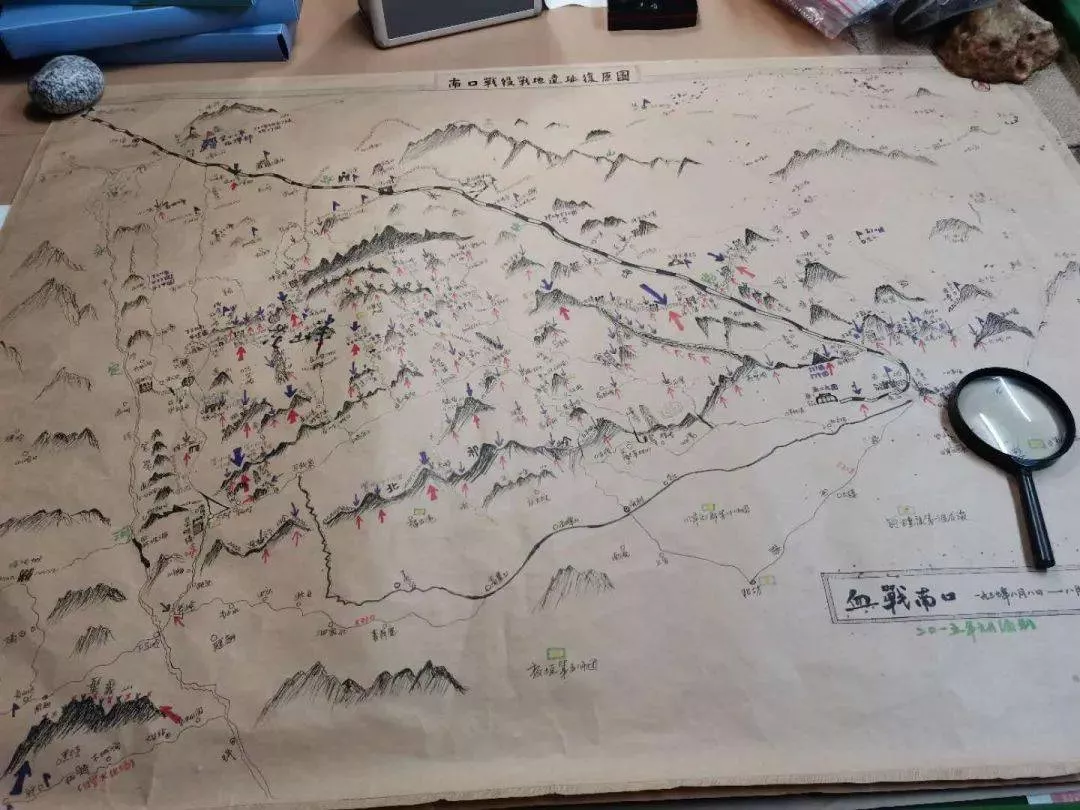 桌球臺(tái)上放著一張南口戰(zhàn)役攻守地圖——這是楊老師十多年里500多次上山勘察,比照史料,一點(diǎn)一點(diǎn)繪制而成的。