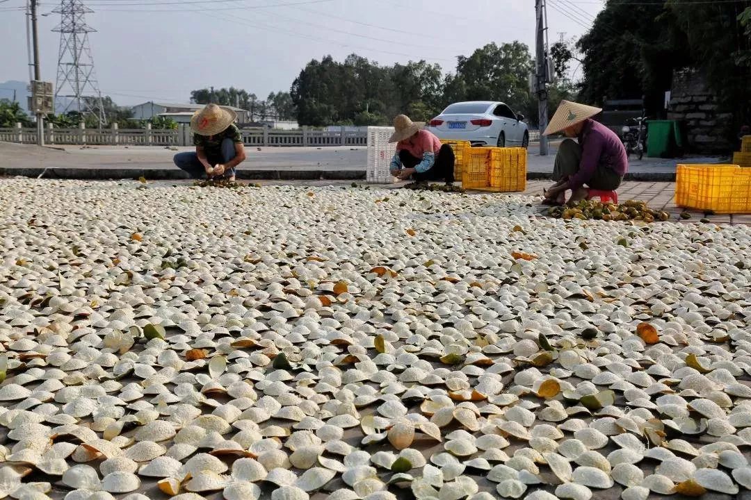 以陽光自然生曬的陳皮,靜待歲月陳香,走在新會(huì)的村落之間,可以說,有陽光照射到的地方,就總能見到當(dāng)?shù)厝嗽谌齼蓛傻厣鷷耜惼ぃ@是他們幫補(bǔ)家計(jì)的一種途徑,這更是家家戶戶的日常。