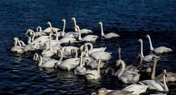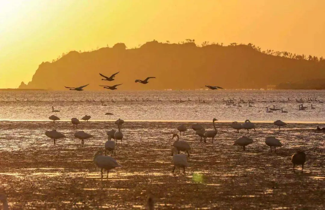 大天鵝對(duì)生存環(huán)境選擇比較苛刻,只有良好的水質(zhì)、豐富的食物以及安全的環(huán)境才能贏得她們的青睞。得益于榮成優(yōu)越的自然生態(tài)和良好的環(huán)境保護(hù),每年11月份,成千上萬(wàn)只大天鵝、野鴨、大雁等鳥(niǎo)類不遠(yuǎn)萬(wàn)里,從西伯利亞、內(nèi)蒙古等地呼朋喚友,成群結(jié)隊(duì)悄然降落,來(lái)榮成棲息越冬。他們?nèi)宄扇海瑫r(shí)而水中漫步、覓食嬉戲,時(shí)而結(jié)伴齊飛、翩翩起舞,為秋冬榮成的增添了一抹靚麗的風(fēng)景。