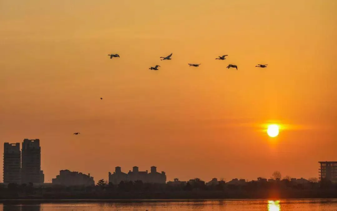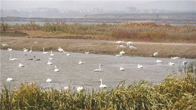 從10月16日發(fā)現(xiàn)7只大天鵝,到11月13日湖面上已經(jīng)有了150余只大天鵝的蹤跡,近處城區(qū)的高樓大廈、沿岸的草木,倒映在清幽潔凈的湖水中。白色的天鵝自由自在地游弋、覓食、飛翔,動(dòng)靜相宜為暮秋的濱海小城增添了靈動(dòng)的氣息!
