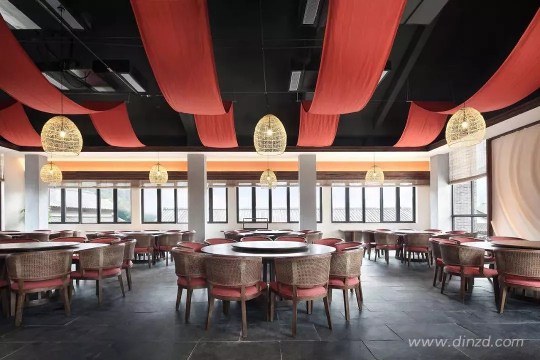 ?一樓素食餐廳色調(diào)暖黃,曰晨,曰向陽,寓意初生的太陽,一日之晨,生機(jī)無限;二樓的葷食餐廳則色彩濃烈,紅色彩帶如行云流水般點(diǎn)綴其間,起心念,動食指,噴薄而熱烈,充滿能量。設(shè)計(jì)師希望人們在用餐時(shí)懂得珍惜和感恩。