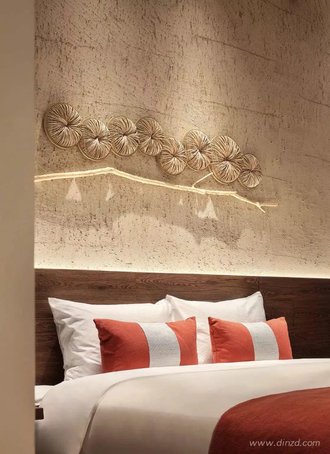 床頭藝術(shù)掛件取自“一枝獨(dú)秀”的花枝形態(tài),以此呼應(yīng)杏花居的主題。花木有時(shí),幽居以花為伴,一室清雅,更自可愛。
