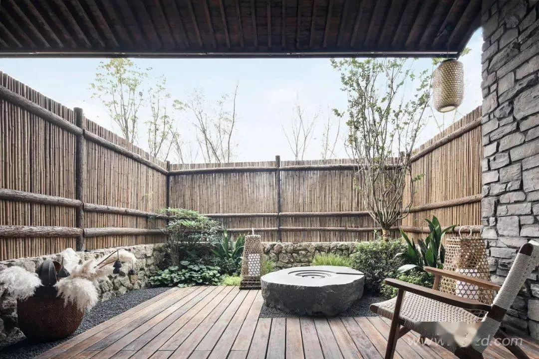 客房布草裝飾選用棉麻材質(zhì),色彩過渡柔和,給人暖意。床頭的實(shí)木雕畫回歸原野古樸,竹編吊燈造型各異 ,一花一草一木皆入景,簡而裁,巧而自然。竹藏風(fēng)雨,觸及野趣,山居生活隱逸悠然,靜念生長。