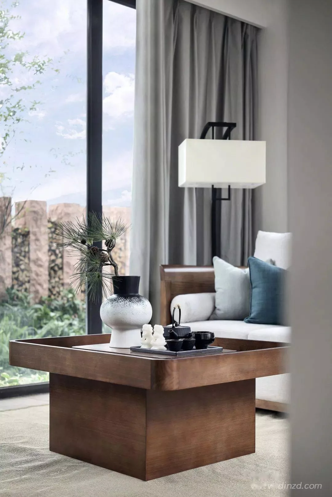 杏花柔媚,花色潔白,大堂延續(xù)著素雅之美;樹榴茶桌長短廣狹不齊,置之于室,古雅溫潤;從疏線到編織,劍麻地毯的鋪陳,簡樸之中清新蔓延。?