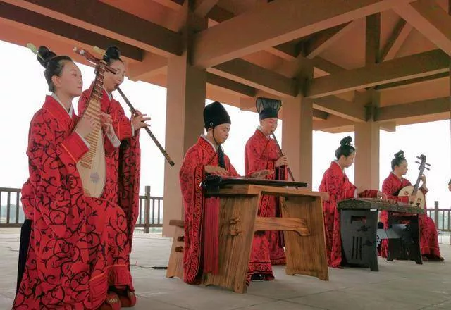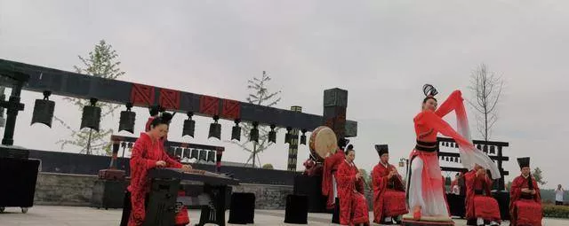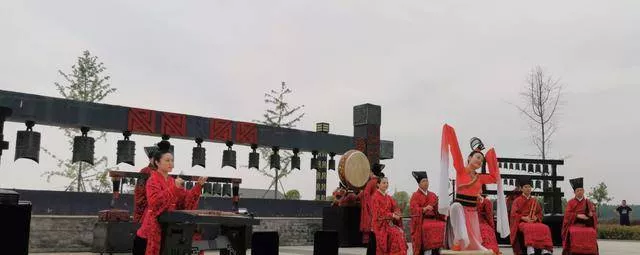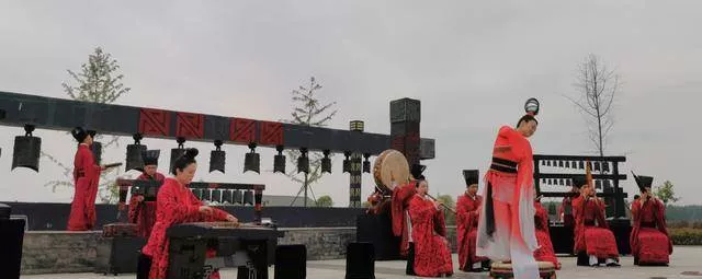 廣場上,編鐘、錦瑟、虎座鳳架鼓等從城陽城址出土的古典樂器,經(jīng)過復制組成了古典樂隊,演奏著周王宴飲的迎賓樂歌:《詩經(jīng)小雅鹿鳴》,歡迎我們的到來。