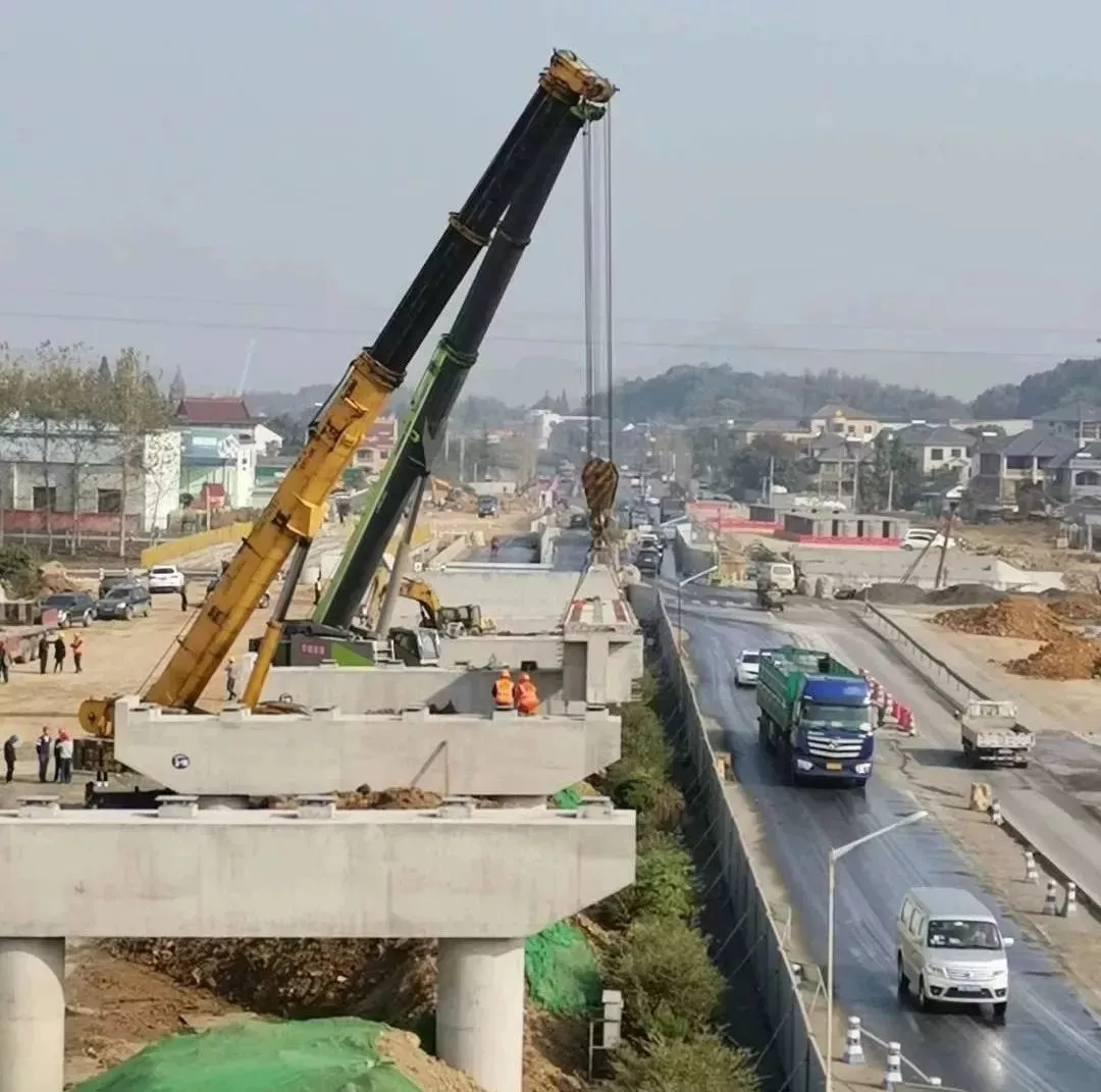 昨天,104國道德清段改建工程高架橋正式進(jìn)入梁板架設(shè)階段!首片30m預(yù)制T梁在武康高架Ⅰ橋右幅順利完成架設(shè)!武康高架橋武康高架橋全長4.481km,寬度直線段為27m,匝道加寬段最大寬度為47.8m。其整體采用雙向6車道,地面采用雙向四車道。在充分考慮橋梁整體情況下,采用汽車吊和架橋機(jī)相結(jié)合的方式架梁,11月9日架設(shè)的第一片30mT梁正是采用汽車吊架設(shè)的施工方式。