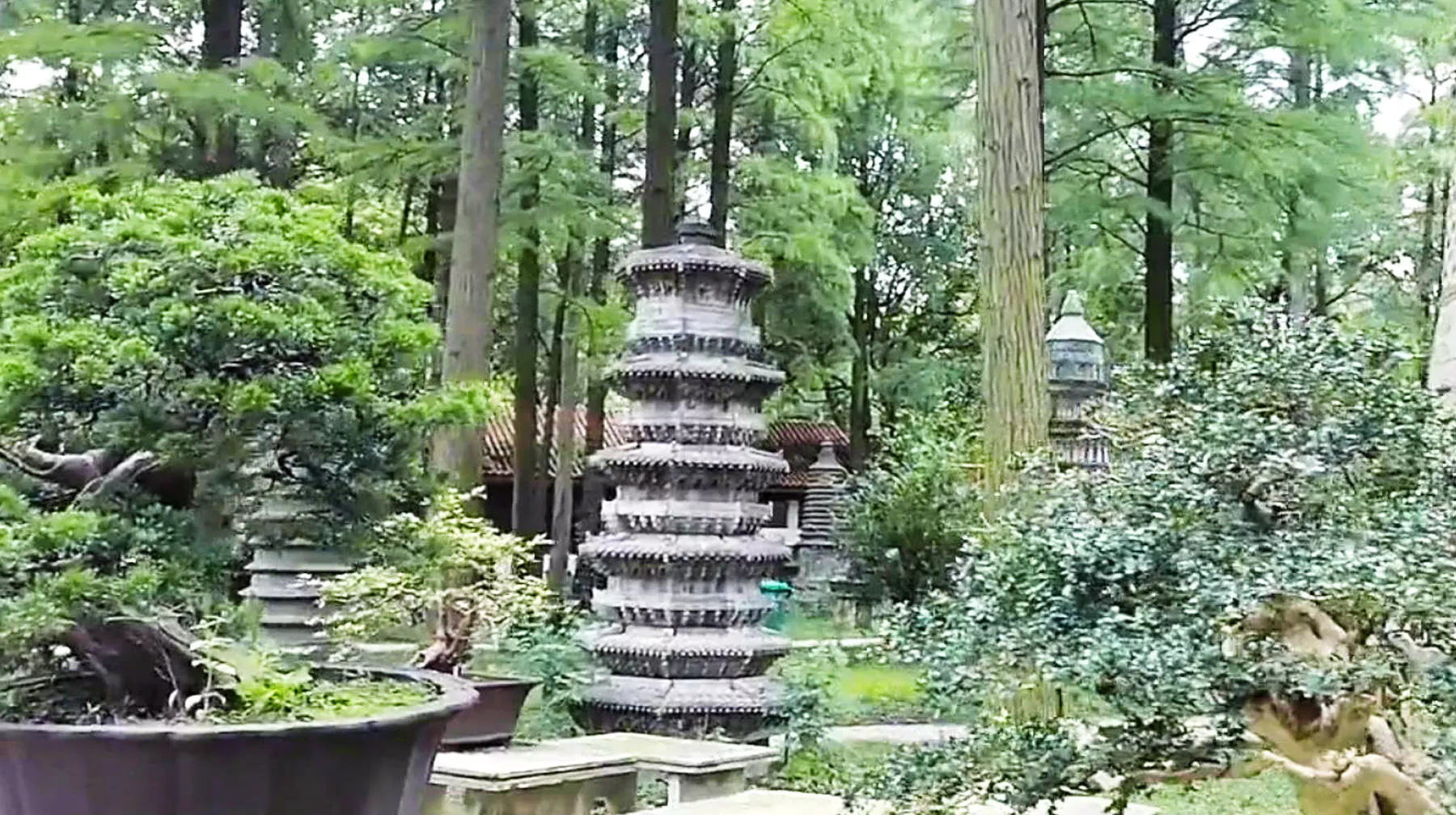 在橋上看中華名塔園,差不多已經(jīng)能夠看到整個(gè)園區(qū)的全貌,主要是因?yàn)橹虚g的主塔足夠高,植被的輪廓正好在中間一片區(qū)域里。進(jìn)入到中華名塔園后,視角又完全轉(zhuǎn)換,密林一下子近在眼前,但又不是那種非常擁擠的感覺(jué),這與里面的根雕盆栽分布有關(guān)??赡艿谝淮芜M(jìn)去會(huì)被那些盆栽吸引,但真正仔細(xì)欣賞的時(shí)候又能不自覺(jué)看到旁邊的各類寶塔,它們與盆栽放在一起,相互映襯,成為一道靚麗風(fēng)景。