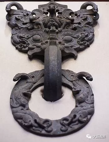 燕國宮門構(gòu)件。1966年易縣燕下都遺址老姆臺出土,長74.5厘米,作獸面銜環(huán)狀。器形巨大,紋飾華麗,形象生動,具有極強的藝術(shù)感染力。系燕國代表性器物,已被用作新館大廳環(huán)境裝飾。