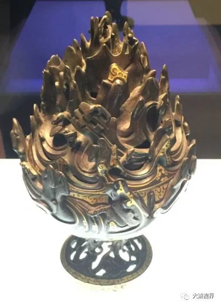 熏香用具。1968年滿城縣陵山中山靖王劉勝墓出土,通高26厘米。通體用金絲和金片錯出舒展的云氣紋。爐盤上部和爐蓋鑄出高低起伏的山巒。爐蓋上因山勢鏤孔,雕塑出生動的山間景色。爐柄透雕成三龍出水狀,以龍頭擎托爐盤。工藝精湛,裝飾華美,舉世聞名。