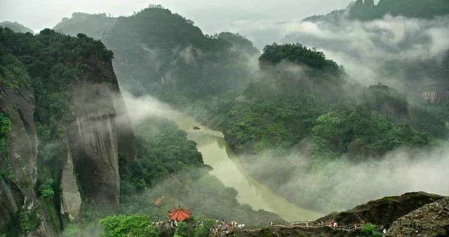 武夷山集山岳、河川風(fēng)景于一身,不僅"奇、秀、美、古"兼而有之,而且在山與水的緊密結(jié)合 、人文與自然和諧統(tǒng)一上達(dá)到絕妙的境界。清澈碧綠的九曲繞山而行,曲折縈回;發(fā)育典型的丹霞地貌千姿百態(tài);再加上神秘的古閩越族文化,自然山水之中溶注著濃郁的人文氣息。游人乘坐古樸輕巧的竹筏順溪而下,既可飽覽武夷溪光山色、瞻仰兩岸文化古跡,又可享受桂林的詩(shī)情畫意、領(lǐng)略百勝灘的驚險(xiǎn)刺激,令人嘆為觀止。