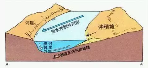 當(dāng)水流向凹岸方向沖去,凹岸受到強(qiáng)烈侵蝕,形成深槽,同時(shí),在河底產(chǎn)生向凸岸的補(bǔ)償水流,將底層水流壓向凸岸,把從凹岸侵蝕下的物質(zhì)搬運(yùn)至凸岸,故凸岸流速變慢而堆積。