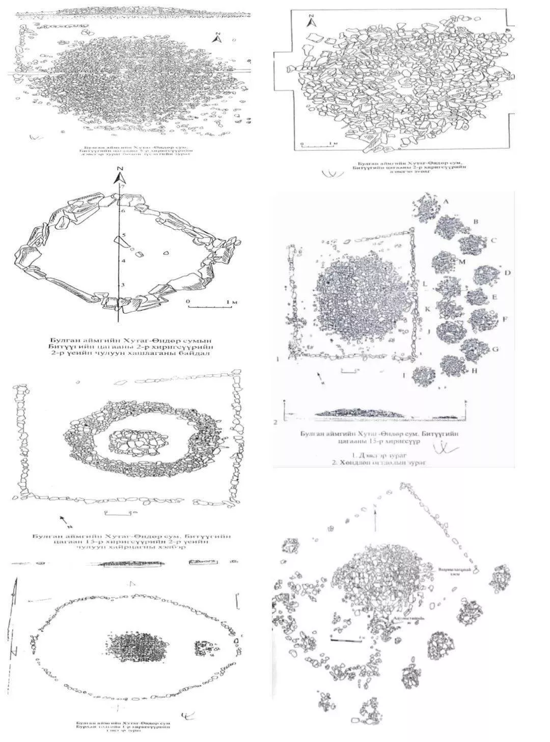 墓葬研究是考古學(xué)研究中極其重要的內(nèi)容之一,對墓葬的研究是復(fù)原史前社會面貌的重要手段。因?yàn)?,社會生產(chǎn)力的發(fā)展與變化直接影響到當(dāng)時社會的埋葬制度與埋葬習(xí)俗。遠(yuǎn)古時期的墓葬與其他類遺跡相比,通常更容易完整的保存下來。因此,將考古資料觀察到的墓葬外部形制的變化進(jìn)行對比,得出當(dāng)時社會發(fā)展情況及人們對死后進(jìn)入另一個世界的理解與推斷——靈魂觀念的產(chǎn)生以及原始先民古樸的宇宙觀的形成,都具有重大意義。蒙古國石堆墓圖[7]。