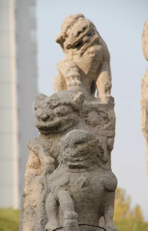 石雕華表柱雕刻中的那對天安門前的石雕華表柱它高大挺拔,渾樸壯觀,直徑還帶有層層回環(huán)不斷的云朵柱身之上,盤繞著一條巨龍,龍有四足,雕刻卓越生動,給人以遨游云天之感。在雕刻龍巨柱頂端,橫叉著白石云翹,呈現(xiàn)出云朵狀,云翹上是承露盤,盤上蹲著各瑞獸,名叫“望天”他的頭朝天上向望。