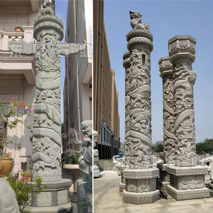石雕華表雕刻是由柱礎(chǔ)、柱身和承露盤組成,柱身盤繞著一條巨龍,雕刻出的巨龍張牙舞爪,氣宇軒昂身軀盤旋在柱身之中。石雕華表柱中的龍體雕刻精細(xì),富有動感,石雕華表柱的柱身的主體龍紋是用淺浮雕雕刻出盤曲而上的龍形,中間加以云紋華飾,使得石雕華表柱魁麗而莊嚴(yán),石雕華表柱中的龍的頭部及前半部分用的是圓雕,內(nèi)圓柱,單條巨龍繞柱身,龍自云端之中蜿蜓盤繞而下。龍鱗身、鹿角、蝦須,張口咧嘴,昂首挺胸。雕刻出的石雕華表柱中的龍的體態(tài)矯健、飄逸,構(gòu)思精妙絕倫,運刀準(zhǔn)確、流暢,雕刻技藝精湛嫻熟。這樣雕刻出的華表柱即魁麗而又莊嚴(yán),還能體現(xiàn)出中國文化形象。