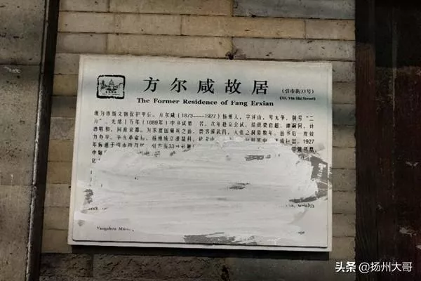 方爾咸(1873—1927),同治十二年(1873年)出生。揚(yáng)州人。光緒十五年(1889年)中鄉(xiāng)試第一名。次年赴京會試,“因回避考官而未能入場”。因目睹清廷腐敗,知科舉非興國之途,遂不再應(yīng)試。為擇求富國強(qiáng)兵之道,曾客游武昌,入湖北張之洞處充當(dāng)幕僚數(shù)年。返鄉(xiāng)后,一度致力于興辦教育,振興實(shí)業(yè)。辛亥革命后,揚(yáng)州成立淮鹽科,徐寶山委托方爾咸負(fù)責(zé),參與分利,遂成巨富。民國16年病逝于揚(yáng)州引市街故居。