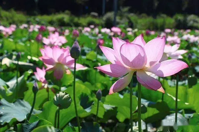 荷葉羅裙一色載,芙蓉向臉兩邊開;亂入池中看不見,聞歌始覺有人來?!笔⑾牡娜A億莊園,近300畝荷花燦爛盛開,花期將持續(xù)到10月份。