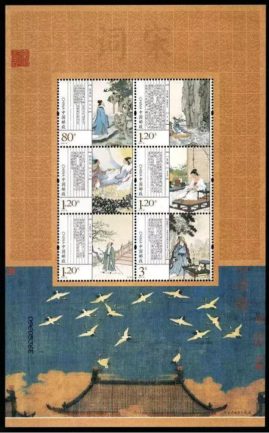 《宋詞》特種郵票1套6枚,此套郵票采用縮微工藝將宋詞三百首文字印制在郵票周邊,邊紙所用圖案為宋徽宗趙佶所作《瑞鶴圖》。