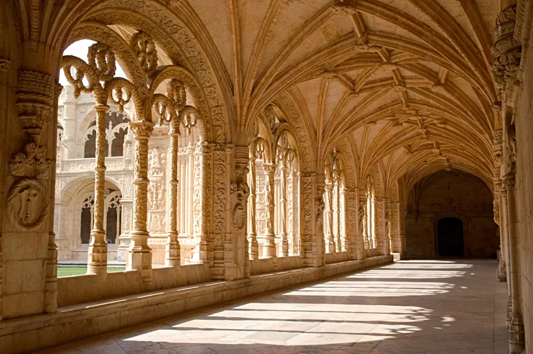 熱羅尼莫斯修道院是位于貝倫區(qū)的一座華麗宏偉的修道院,不僅是里斯本最突出的古跡,也是葡萄牙的標(biāo)志性建筑之一,1983年與附近的貝倫塔一起被聯(lián)合國(guó)教科文組織列為世界文化遺産。從空中鳥瞰,教堂像是一個(gè)橫短豎長(zhǎng)的拉丁十字形,外表全部用打磨得光滑平整的白色花崗巖砌成,非常宏偉、圣潔。三十對(duì)數(shù)十米高的塔尖直指蒼穹,給人一種擺脫塵世的感覺。修道院的內(nèi)殿寬敞圣潔,哥特式的大廳拱頂高聳,大廳中央的圣壇用金和綠色的雕刻裝飾,旁邊的圣壇立有赤紅色釉瓷作成的圣熱羅尼莫像。