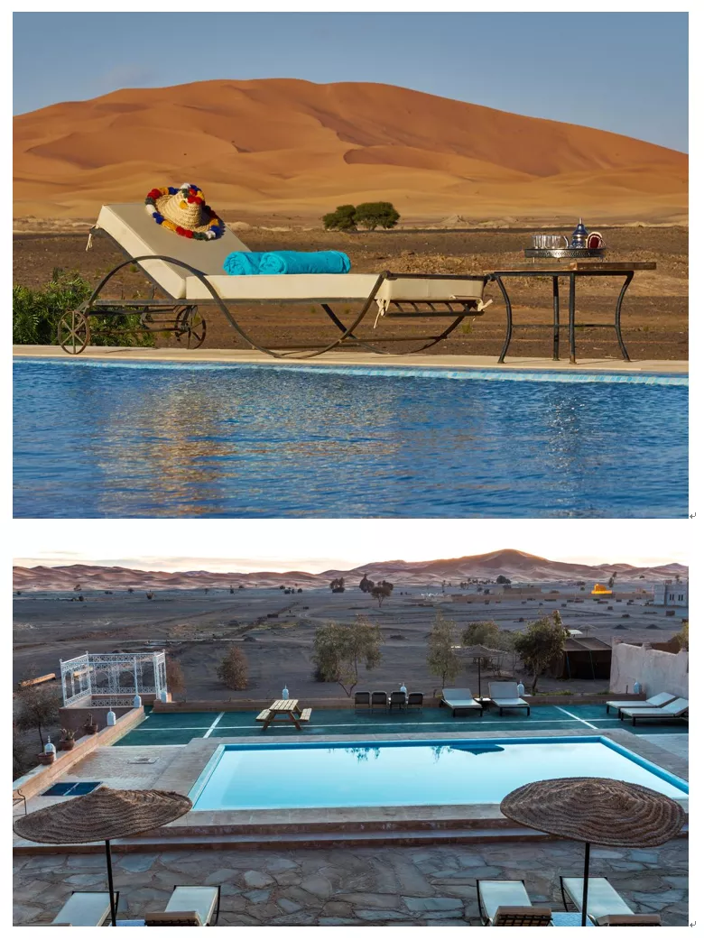 3.豪華私人團(tuán);豪華沙漠團(tuán)貴在食宿。第一晚是古堡大酒店,設(shè)施齊全,環(huán)境好,位置在達(dá)德斯峽谷邊上,還有室外游泳池。不僅在進(jìn)沙漠之前可以進(jìn)行一次好好地休息修整,而且風(fēng)景無敵,隨便一拍都很美麗。晚餐和早餐也比較豐盛。
