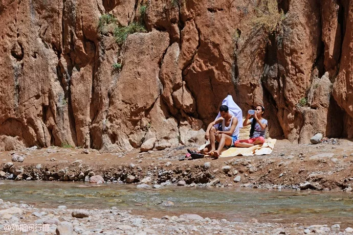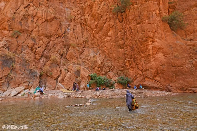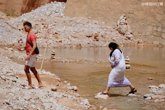 在谷底有一條細(xì)小的河流穿過而過,旁邊是一條不算寬敞的路,車子能從這里穿過峽谷,我們也得以在此地停留,感受大自然的雄偉壯麗和鬼斧神工。在峽谷里的小河中,有許多當(dāng)?shù)厝嗽诖藨蛩藳?。對于長期生活在沙漠和戈壁,面對水資源匱乏的摩洛哥人來說,峽谷中這條河流絕對稱得上是平民的天堂,避暑的秘境。頂著灼燒的烈日,耐著45度的高溫,能在這處清涼的河水里洗洗臉、泡泡腳,不管是當(dāng)?shù)厝诉€是游客都是極其奢侈的享受。河水很淺,最深處只能沒過小腿肚,但當(dāng)?shù)厝硕技娂娬镜剿?,有些甚至整個人躺著,讓這難得的清涼感滲透全身。就連平時保守害羞的婦女,也忍不住包著裙衣站立其中,戲水納涼。