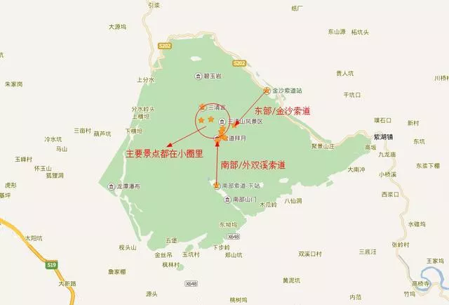 我們放大三清山的地圖,看起來陰影部分很大,實際上游玩的路線就是我畫的那個小圈,當(dāng)然也別小看這個小圈,畢竟走一圈要8個鐘,所以我們看地圖的時候要把外邊的大圈自動過濾掉。