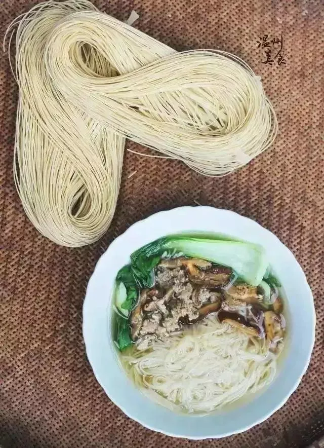 素面直徑通常小于1.3毫米,以歷史悠久論,首推永嘉,因永嘉在楠溪江流域,鄉(xiāng)人稱為楠溪素面。素面味冷而清,可浸于肉湯或丸子中,亦可下至醬油中,而不澆于其他食物之上。醬油通常是鰹海鮮味,可以混與大蔥、生姜以及青蒜。楠溪江沿岸村民歷來將素面視為食中珍品,待客首選之物,民間送月子回禮的“紗面湯”券指的就是素面(方言的另一種音譯)。