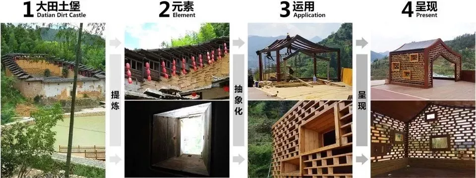 設(shè)計(jì)抽象提煉了大田國(guó)家級(jí)歷史文化保護(hù)建筑“土堡”來(lái)進(jìn)行鄉(xiāng)土文化傳承,用“虛實(shí)相間”的木網(wǎng)格象征土堡的土墻、 “米斗狀”的木窗象征土堡的瞭望窗,鋼管形成土堡的屋檐。會(huì)隨時(shí)間變化的紅色銹鋼來(lái)象征大田特有的“紅壤”并融入周邊環(huán)境。