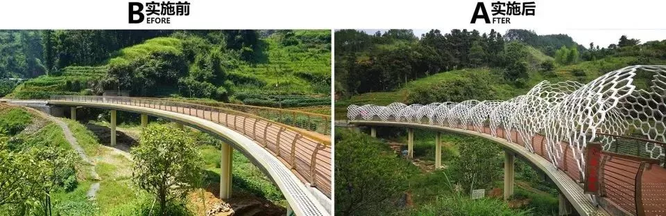 設(shè)計(jì)提煉:5根圓橋墩抽象成“連接把手”,主梁體抽象成“板凳”,橋上的異型雙曲面鋼結(jié)構(gòu)網(wǎng)架抽象成“龍身”,菱形的網(wǎng)架肌理象征板凳龍的竹編表皮,網(wǎng)架端部與綠葉融合抽象成龍尾與龍首,通透的網(wǎng)架表皮“似有非有”傳達(dá)了“龍現(xiàn)無(wú)形”的意境。設(shè)計(jì)摒棄傳統(tǒng)具象的龍的形態(tài)設(shè)計(jì),而是將大田板凳龍的形象抽象并提煉升華,用現(xiàn)代的鋼材料和城市雕塑手法,對(duì)大田鄉(xiāng)土建筑進(jìn)行探索表達(dá)。