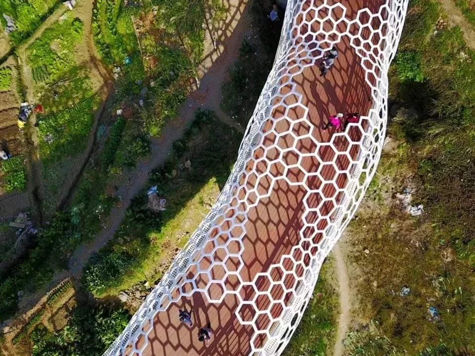 橫跨鳳凰谷80米長(zhǎng)的“板凳龍橋”,設(shè)計(jì)將大田國(guó)家級(jí)非物質(zhì)文化遺產(chǎn)“大田板凳龍”的形態(tài)進(jìn)行抽象