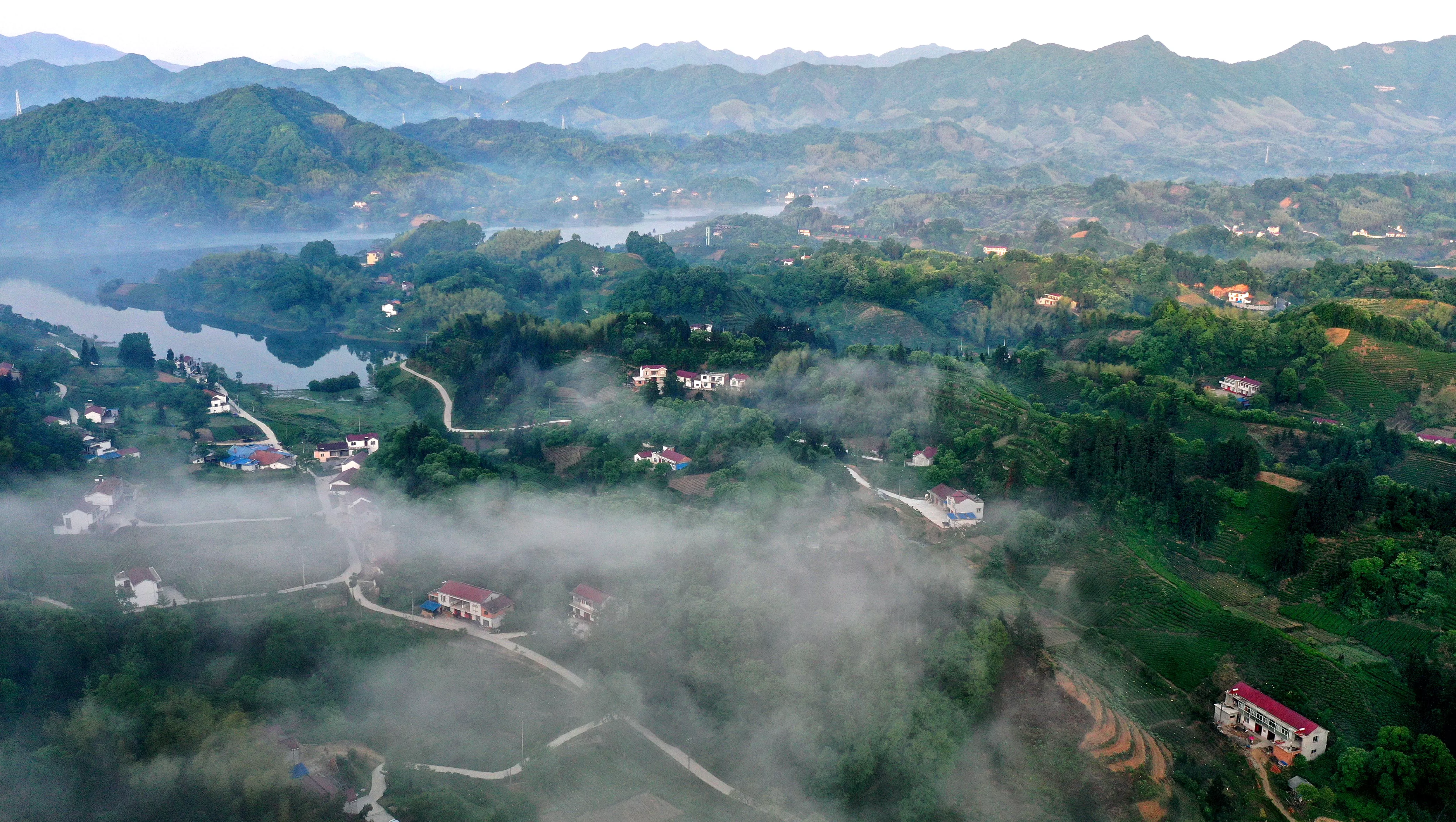 5月3日無(wú)人機(jī)拍攝的金寨縣油坊店鄉(xiāng)的茶園與農(nóng)舍。