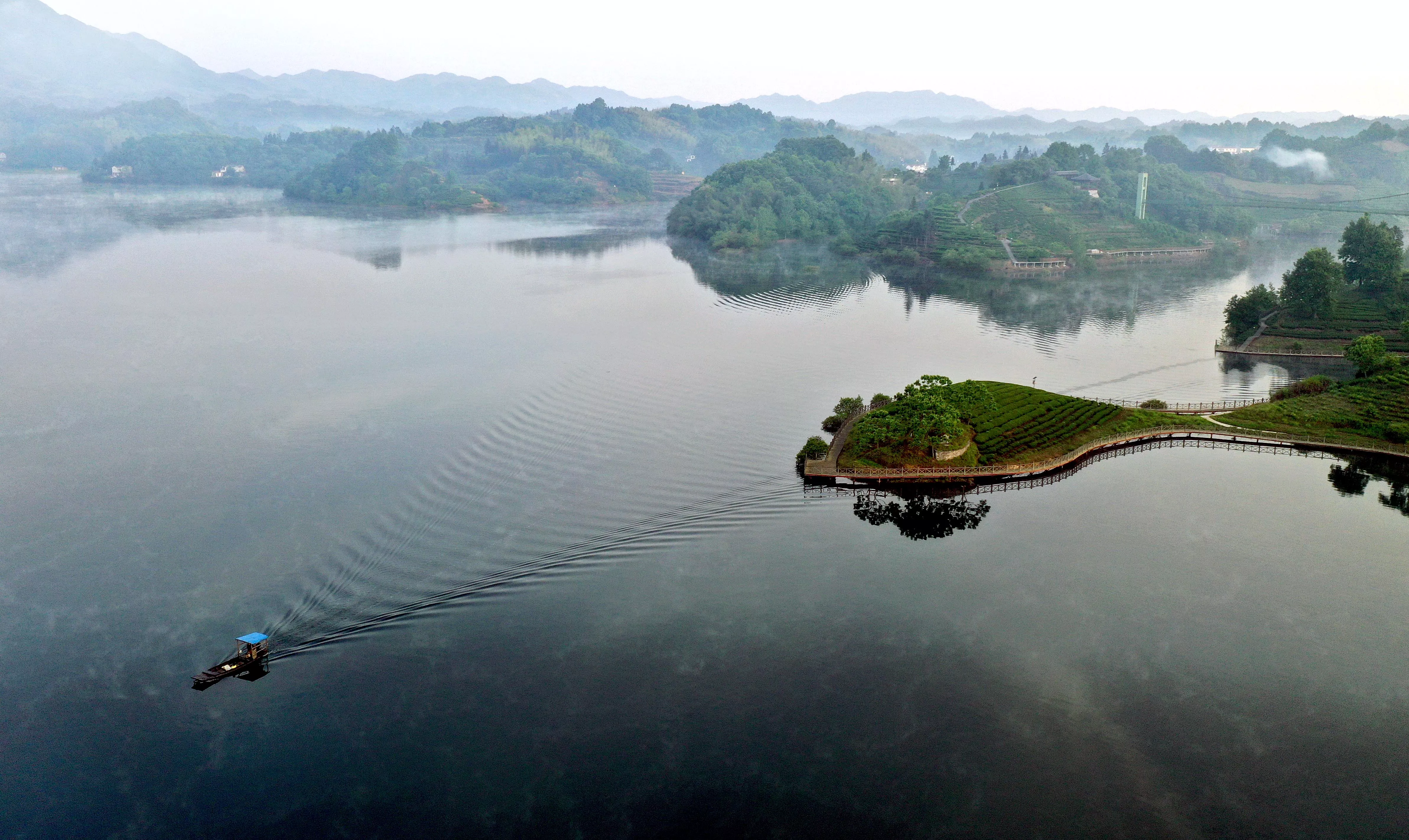 5月3日,茶農(nóng)乘著小船去茶園采摘茶葉(無(wú)人機(jī)拍攝)。