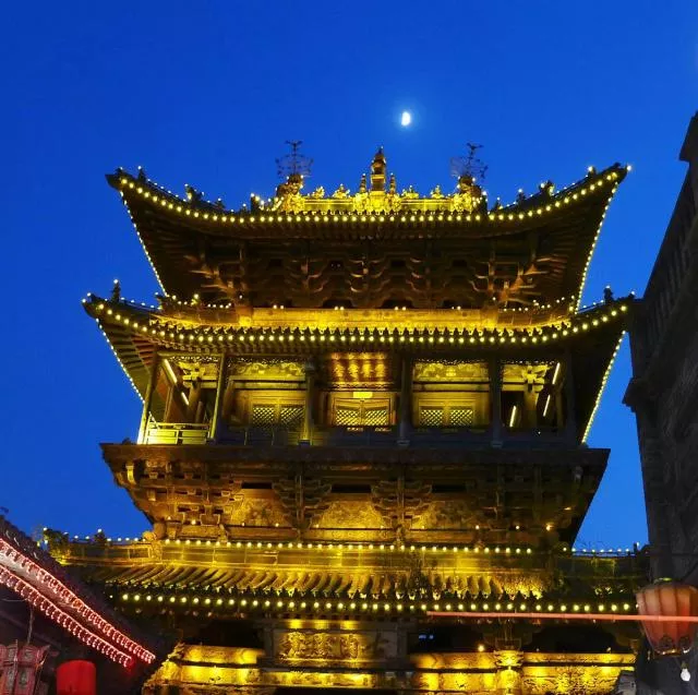 簡介:古市樓高聳在古城中央,與城東清虛觀、大成殿等高大建筑,遙相呼應(yīng),是平遙古城的象征。市樓東南腳下有水井一眼,世傳“井內(nèi)水色如金”,故又名“金井樓”,是本縣古十二景之一。古市樓為三重檐木構(gòu)架樓閣,樓高18米,結(jié)構(gòu)精巧,富麗堂皇。它橫跨南大街,下為通道,東西連接民宅,在樓東南側(cè)有磚階術(shù)梯可登上第二層樓面,中有菩薩像,兩墻有彩畫,是關(guān)公故事。晚上沿街而行,可見古市樓燈光璀璨,蔚為壯觀,是平遙古城不可不賞的夜景。