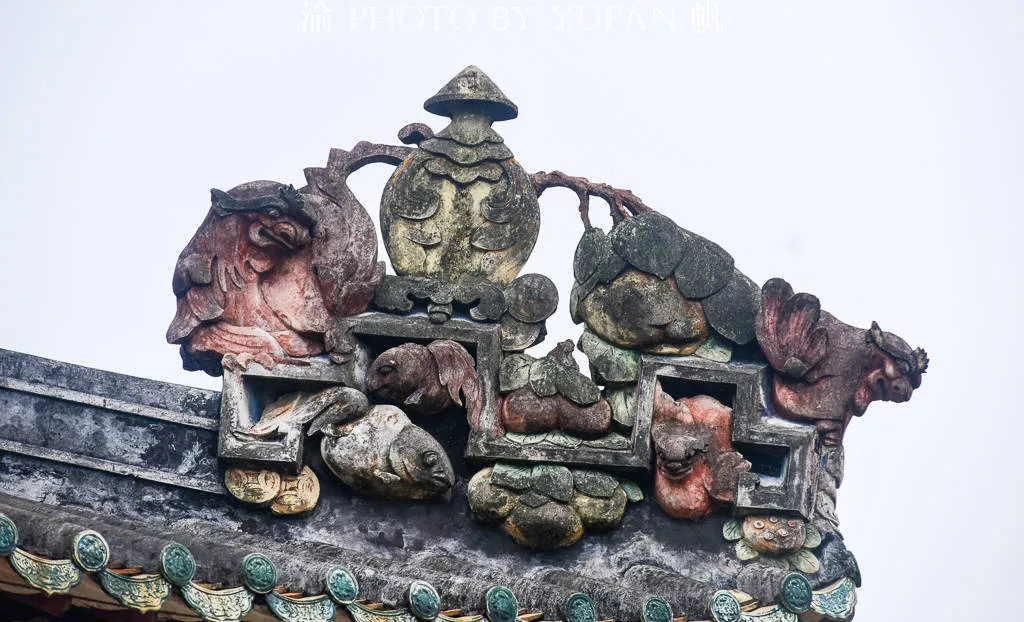 精美的瓦脊太長(zhǎng),拍出來(lái)看不到細(xì)節(jié),我們用長(zhǎng)焦拉近來(lái)看看,幾十米上的瓦脊上全是如此精美的人物故事情節(jié),而且沒有重復(fù)的,每一個(gè)人物都不一樣,有的是陶塑,有的是灰塑,陶塑很好理解,是燒出來(lái)的,灰塑又叫灰批,同樣是佛山具有悠久歷史的民間藝術(shù)之一,灰塑主要用在門額窗框、山墻頂端、屋檐瓦脊、亭臺(tái)牌坊等處。其題材有人物、動(dòng)物、山水、花鳥以及書畫等。在祖廟中,這種禪城傳統(tǒng)的民間灰塑藝術(shù)作品比比皆是。如祖廟兩旁門、額的灰塑:“唐明皇游月宮”、“桃園結(jié)義”,東廊的“郭子儀視壽”,西廊的“哪咤鬧?!钡取4送?,還有:“八仙”,“三英戰(zhàn)呂布”、“劉伶醉酒”以及琴棋詩(shī)畫等題材的作品。