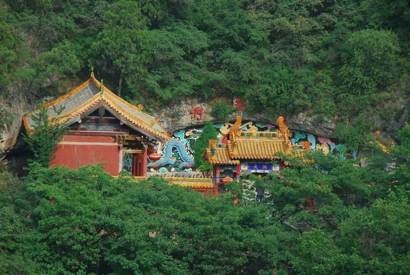 仙堂寺往南里許到達(dá)黑龍洞,名曰“洞天福地”,洞口有兩條巨龍騰躍而起。從月門入洞,有9個(gè)龍頭迎面伸出,個(gè)個(gè)口內(nèi)噴水。再往里走有一石平臺,臺上有一汪清水,龍嘴之水即源于此,當(dāng)?shù)厝苏f此水可治百病,實(shí)為甘美礦泉水。洞后端的洞底盤石宛若兩條彎曲而臥的黑龍,傳為龍王夫婦的起居之地。洞前有龍王殿,內(nèi)塑龍王像。寺院里許山崖如削,峭壁上凌空而建媧皇宮一座,寬五間,為全木結(jié)構(gòu)兩層樓閣。宮底層木柱林立,共32根交錯(cuò)排列,柱頭補(bǔ)間斗拱密布,重檐跋山頂,構(gòu)造奇巧獨(dú)特。周圍高山峻嶺相襯,猶如古畫中的玲戲小屋。還有峰懸石碣觀音洞、云嗷仙樂鐃鈸洞、夜鳴紗車紡花洞、丹爐經(jīng)煙株砂洞、山間明珠金燈巖、點(diǎn)頭迎賓人面石、養(yǎng)僧濟(jì)貧滴谷洞等景點(diǎn)。