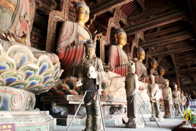 大雄殿是中國古代建筑中最大的單層木結構建筑,被譽為“中國第一大雄寶殿”。大雄殿筑于高3米的臺基之上,為五脊單檐廡殿式,面闊九間,長48.2米,進深五間,寬25.13米,高達21米,建筑面積1829平方米,是佛教頂級建筑,殿內(nèi)主供七尊大佛為原汁原味的遼代塑像,由東至西依次為迦葉佛(貴人佛、成就佛)、拘留孫佛(平安佛)、尸棄佛(健康佛)、毗婆尸佛(興業(yè)騰達佛、智慧佛)、毗舍浮佛(招運佛、發(fā)財佛)、拘那含牟尼佛(光明佛)、釋迦牟尼佛(佛教創(chuàng)始人),七佛皆端坐于須彌座上,通高9米以上。尤以正中的毗婆尸佛最高,合座高達9.5米。因“過去七佛”并列一堂,佛祖釋迦牟尼偏居其中,為佛教界獨一無二。另外,每 尊佛前左右各有一脅侍菩薩相對而立,高2.5米,共14尊。諸菩薩或仰或俯,或斜立或平視,兩足踏蓮花一朵。寶相莊嚴,栩栩如生。