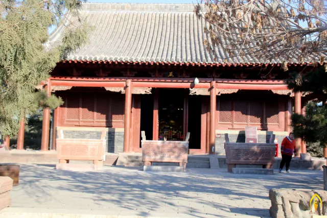 繼續(xù)前行是天王殿,為單檐歇山頂,面闊三間,進深兩間,通面闊16.14米,通進深12.22米。始建于金代天眷三年(1141年),原名萬壽殿,后改為無量殿,清康熙四十九年(1710年)重修。近代按照漢傳寺院傳統(tǒng)格局為依據(jù),更名為天王殿。
