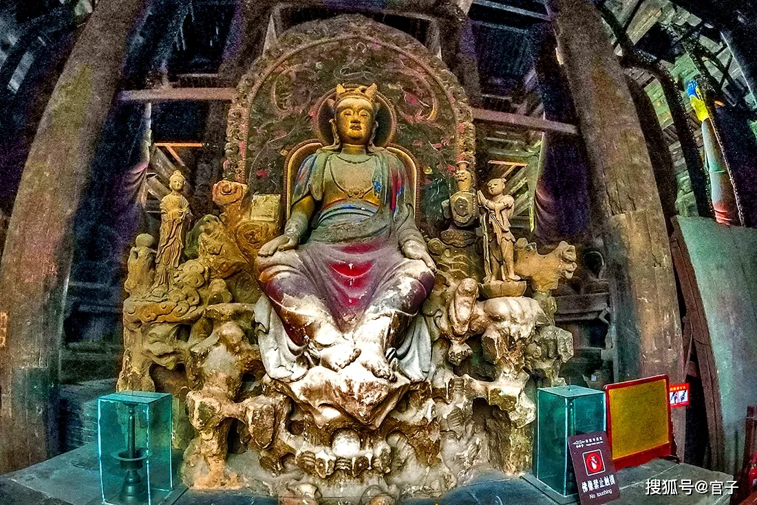 七佛的背后是倒坐觀音,由章子怡主演的《一代宗師》電影就在這里取過景,這是一尊男相觀音,十分少見。我在央視電視《國家寶藏》中看介紹,在觀音兩側(cè)除了善財和龍女還有一鷹與一凈瓶,又稱“鷹瓶觀音”,這種圖像模式的觀音并不多見。不過,這次我真的仔細找了很久,不知這只鷹什么時候飛走了?