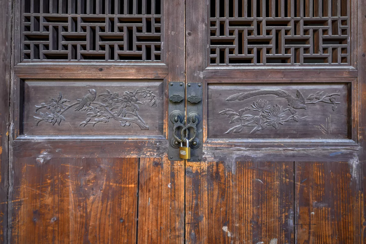 木雕則以門枋、牛腿等為主。千柱屋的木雕絲毫不遜色于磚雕。門窗均為格扇式,分別用梅蘭竹菊、吉祥如意、纏枝花卉等圖案,大的盈尺,小的寸許,內(nèi)容豐富,各具寓意,美不勝收。