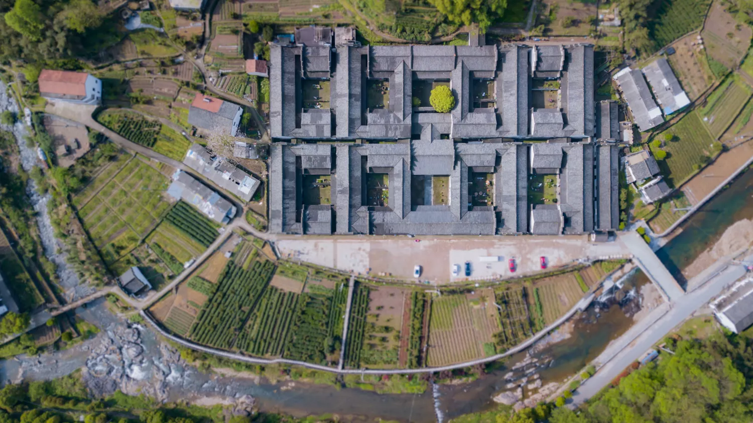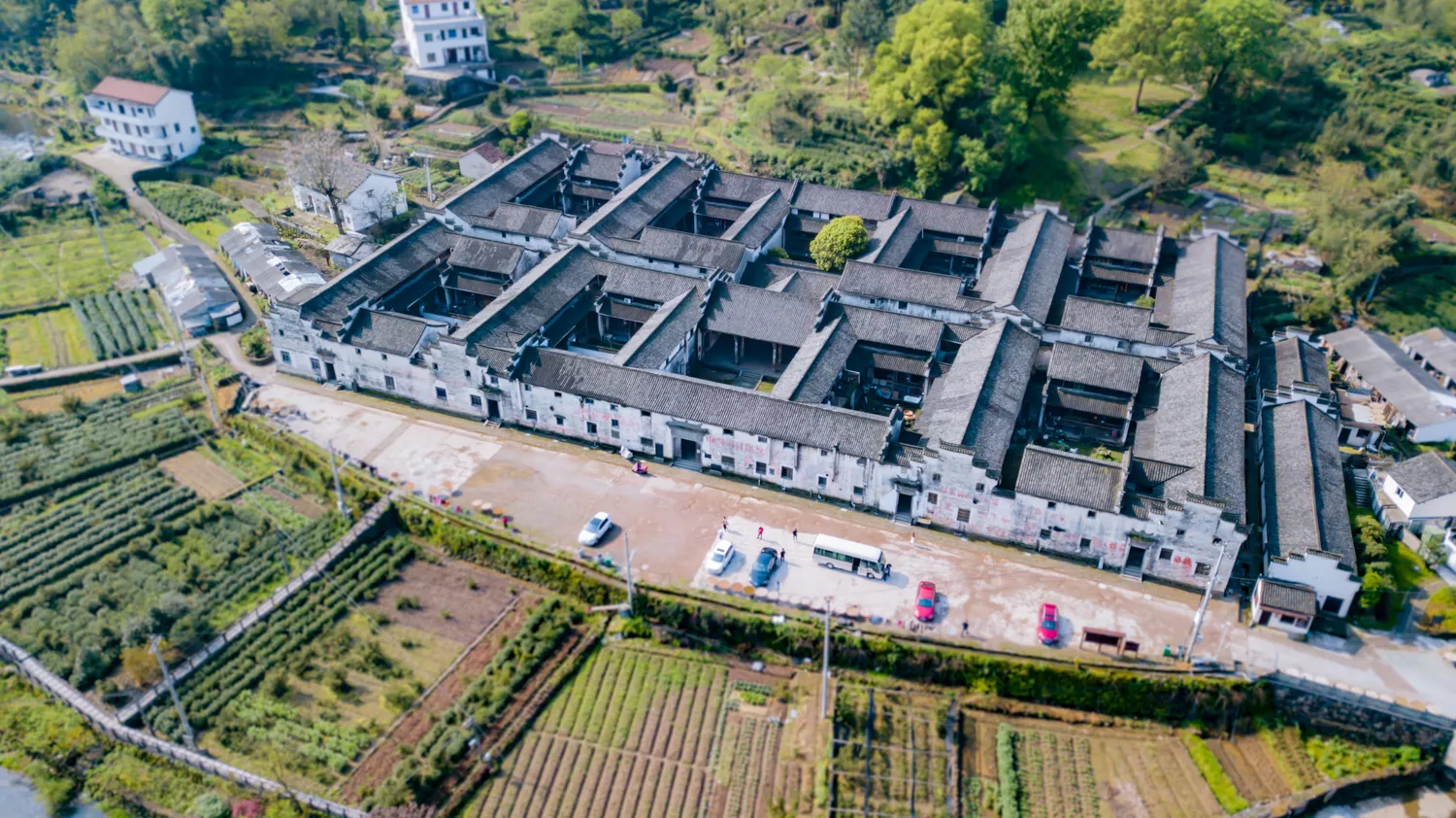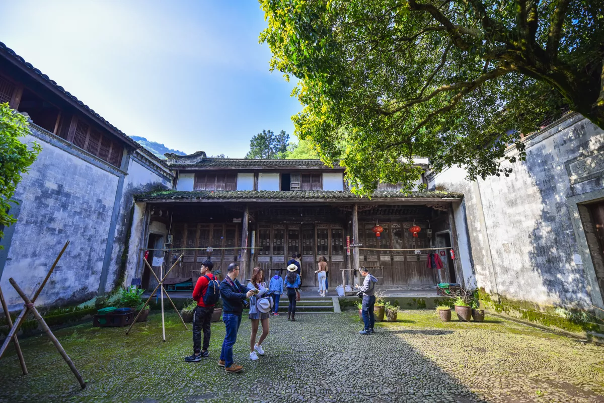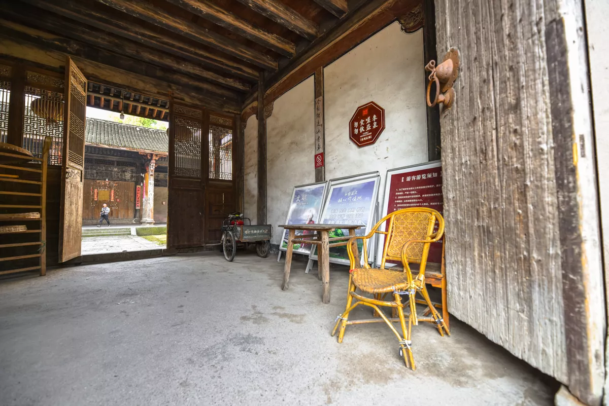 整個斯盛居?xùn)|西通面寬108.56米,南北縱進(jìn)深63.10米,總占地面積6850平方米。門前建有曬場一個,長110米,寬19.50米,面積2145平方米,在深山塢底里有這么大的活動場所,很為少見,這也是千柱屋內(nèi)居民在勞作之余,飯前茶后,相聚嘮叨家常之處。
