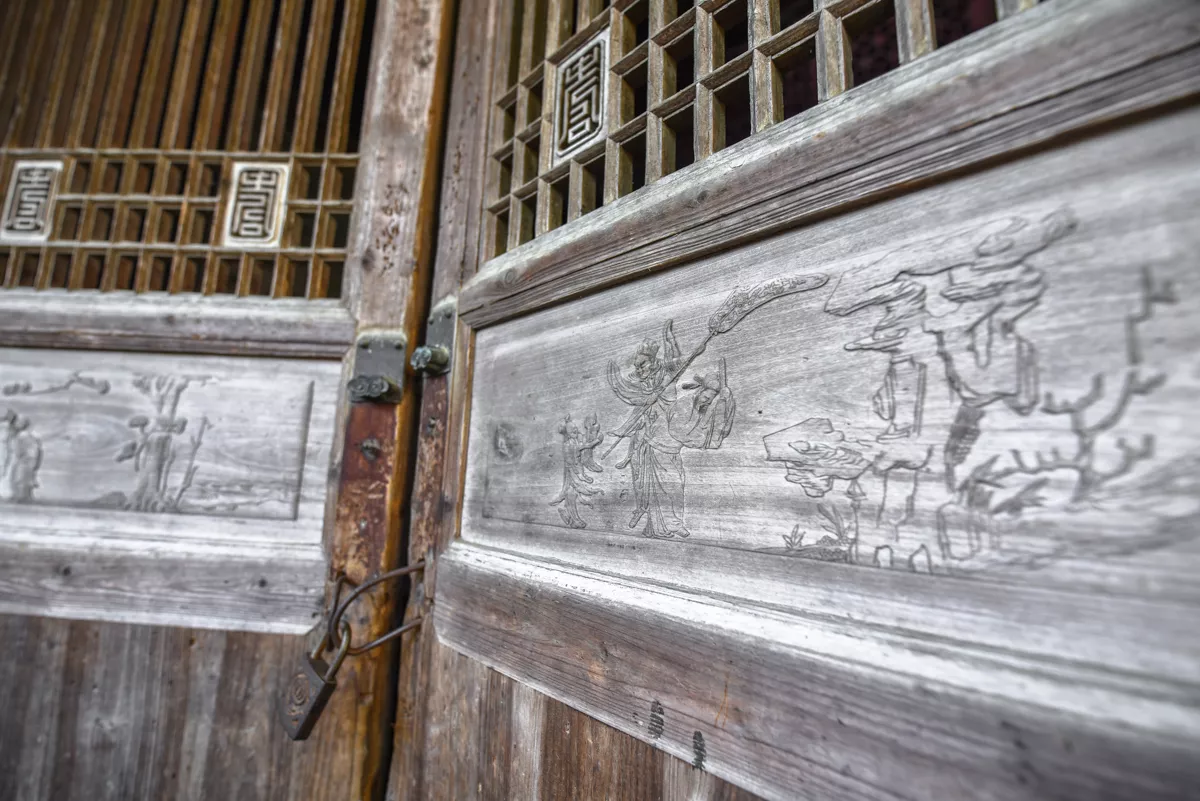 千柱屋門樓均系青石、磚雕制作,鐫刻人物、山水等圖案,形像生動逼真,極其精美。第二道門門額刻有“出將入相”之圖案,其意是出征可為將帥,入朝可為宰相。 第三道門門額上刻有“文王推車”的典故。
