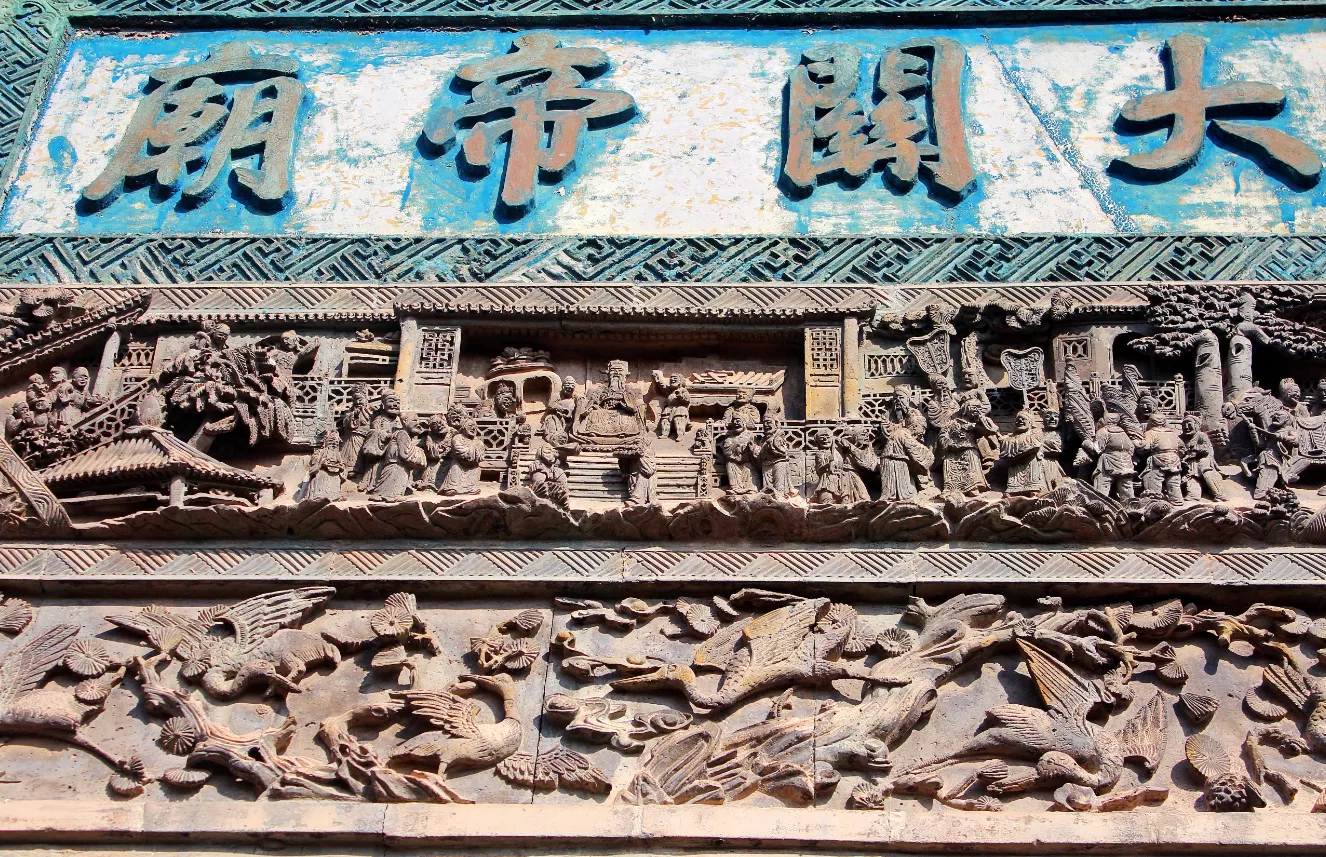 大關(guān)帝廟山門正面墻壁有三門通道,分別是正門、鐘樓和鼓樓。整面墻壁遍布各種浮雕,由水磨磚制成,全部手工雕琢,有兩百余年的歷史。磚雕刻有人物、山水、車馬、城池、亭臺樓閣、花鳥魚蟲等各種事物,組成《李娘娘住寒窯》、《三顧茅廬》、《白蛇傳》等各幕戲曲故事和民間典故,雕工嫻熟,布局整齊,堪稱亳州一寶。