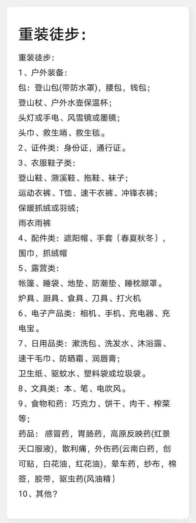 其中卓湘營(yíng)地、曉烏錯(cuò)營(yíng)地更是容易陰天下雨,因此雨衣是必備的,也要用防水袋把背包物品防水做好。再加上有一些可能的涉水路段,因此想提高舒適度,準(zhǔn)備營(yíng)地鞋或者溯溪鞋也是必要的。有一些營(yíng)地比較潮濕,而且夜雨頻繁,除? ??防潮墊要好之外,帳篷的防水性能也同樣重要。多準(zhǔn)備幾個(gè)空塑料袋和垃圾袋也可能用得上。