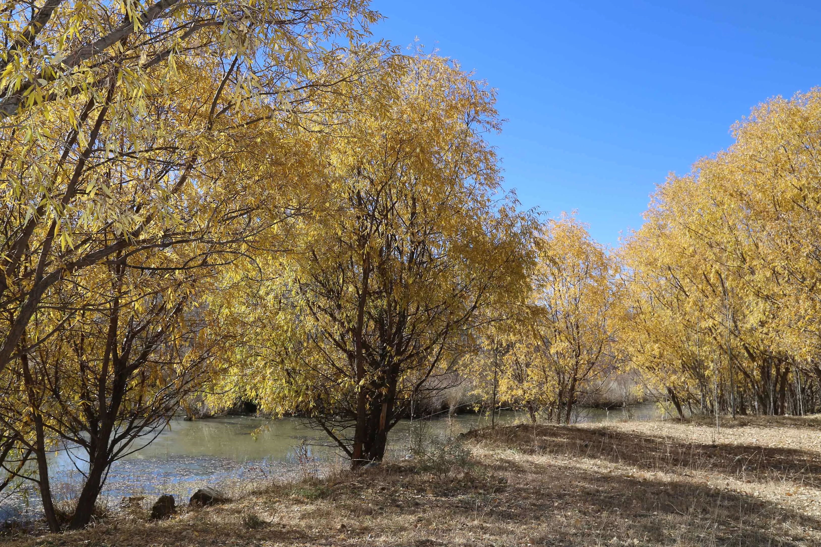 還有一處地方,河水流淌,栽種的一排樹木沿著河岸,估計有四十多顆,樹葉發(fā)黃,在蔚藍色的天空映襯下非常漂亮。
