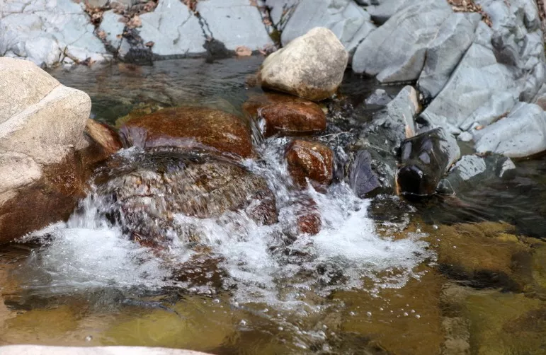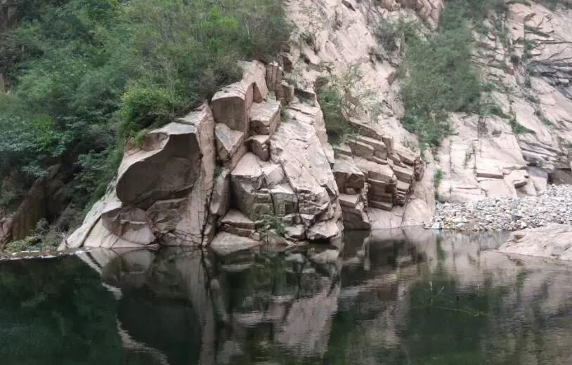 巖層斷裂與流水下切形成的石峽地貌,因巖石中所含的鐵經(jīng)氧化呈紅色,故名紅石峽。峽中常年水流淙淙,如琴弦悅耳